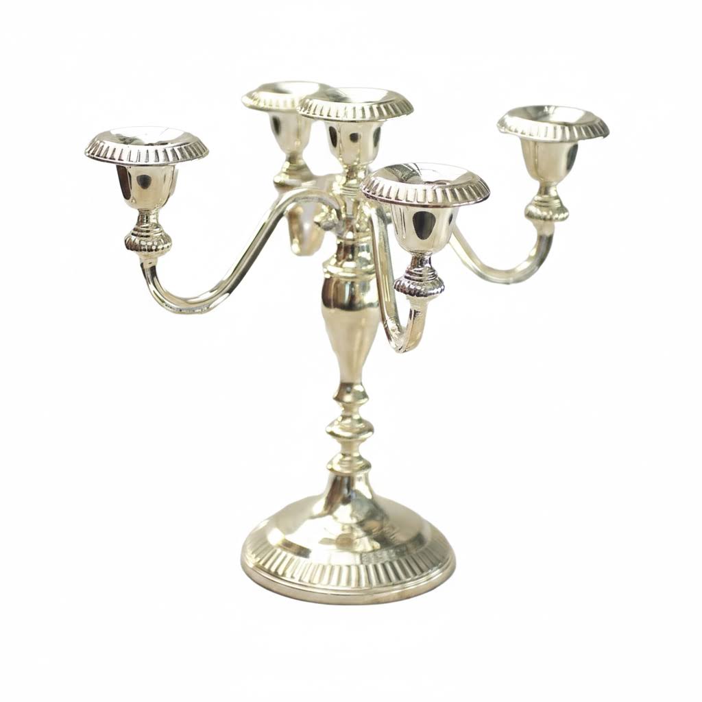 Skab en uforglemmelig atmosfære ved din næste fest med vores elegante 5-armede lysestage. Denne smukke kandelaber, der måler 23,5 cm i højden, er designet i stilfuldt pletsølv, hvilket tilføjer et strejf af luksus til enhver festlig anledning.