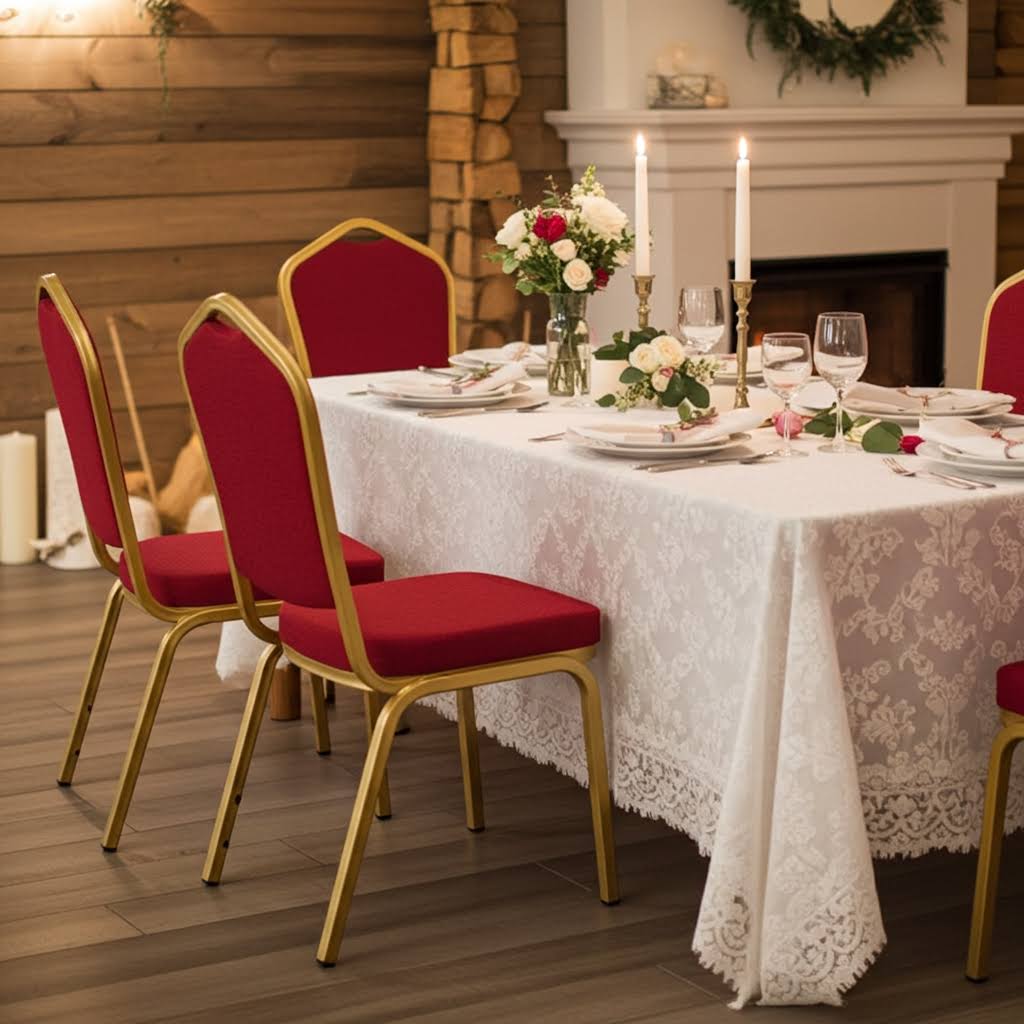 Oplev magien ved vores eksklusive røde guld banquet stol – den perfekte løsning til at skabe en uforglemmelig atmosfære til dit næste arrangement kan du leje denne stol! Ideel til bryllupper, fester, konferencer og andre særlige begivenheder, hvor elegance og komfort går hånd i hånd.